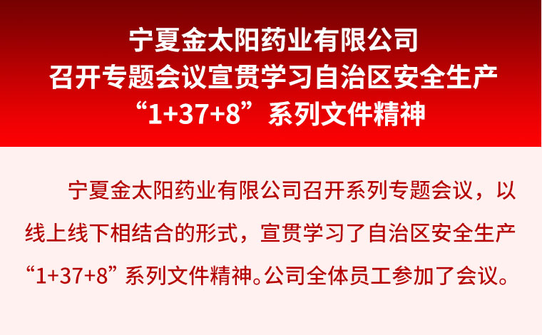 寧夏金太陽(yáng)藥業(yè)有限公司召開(kāi)系列專題會(huì)議,以線上線下相結(jié)合的形式,宣貫學(xué)習(xí)了自治區(qū)安全生產(chǎn)1+37+8系列文件精神。公司全體員工參加了會(huì)議。 會(huì)議宣貫學(xué)習(xí)了: 自治區(qū)黨委 人民政府《…